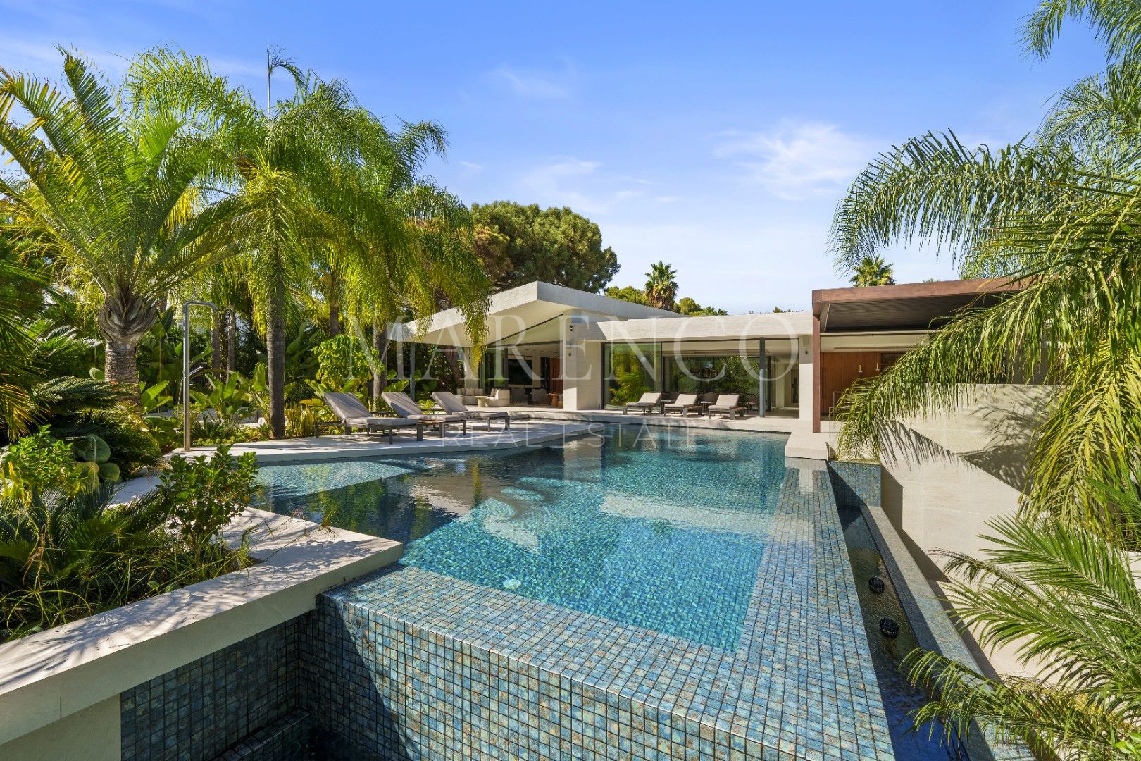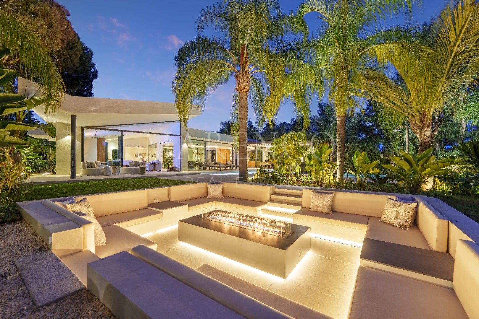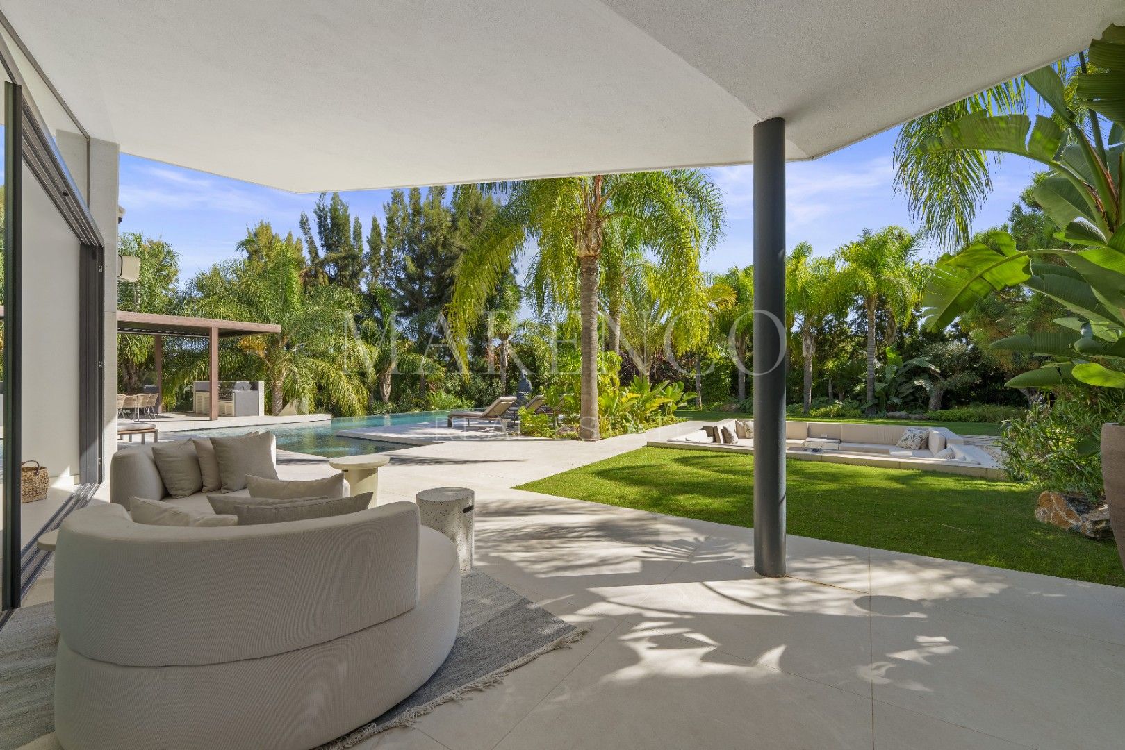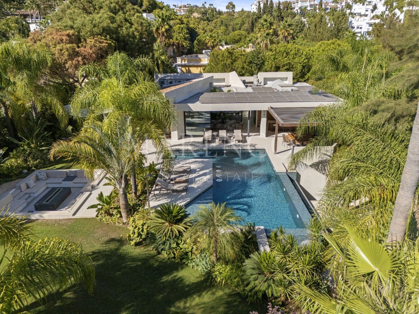 Het exterieur van Las Chapas 5 valt op door de volwassen palmbomen, die verschillende ontspanningsruimtes en een centraal zwembad omringen, dat wordt omgeven door stenen en ligstoelen. Daarnaast beschikt de villa over een overdekte eetterras en een buitenlounge met een verlaagde vuurplaats, die zowel overdag als ‘s avonds een uitnodigende sfeer creëren. Het ontwerp van de villa zorgt voor privacy en maximaliseert tegelijkertijd het genieten van het klimaat van Marbella.
