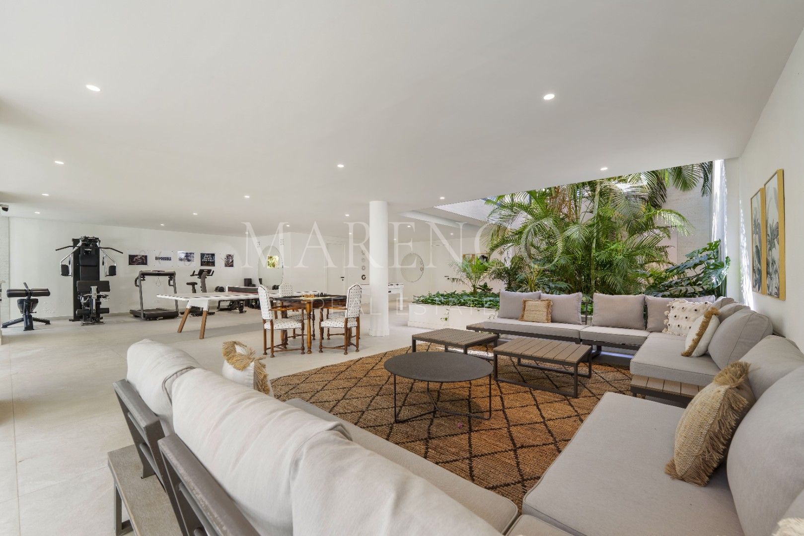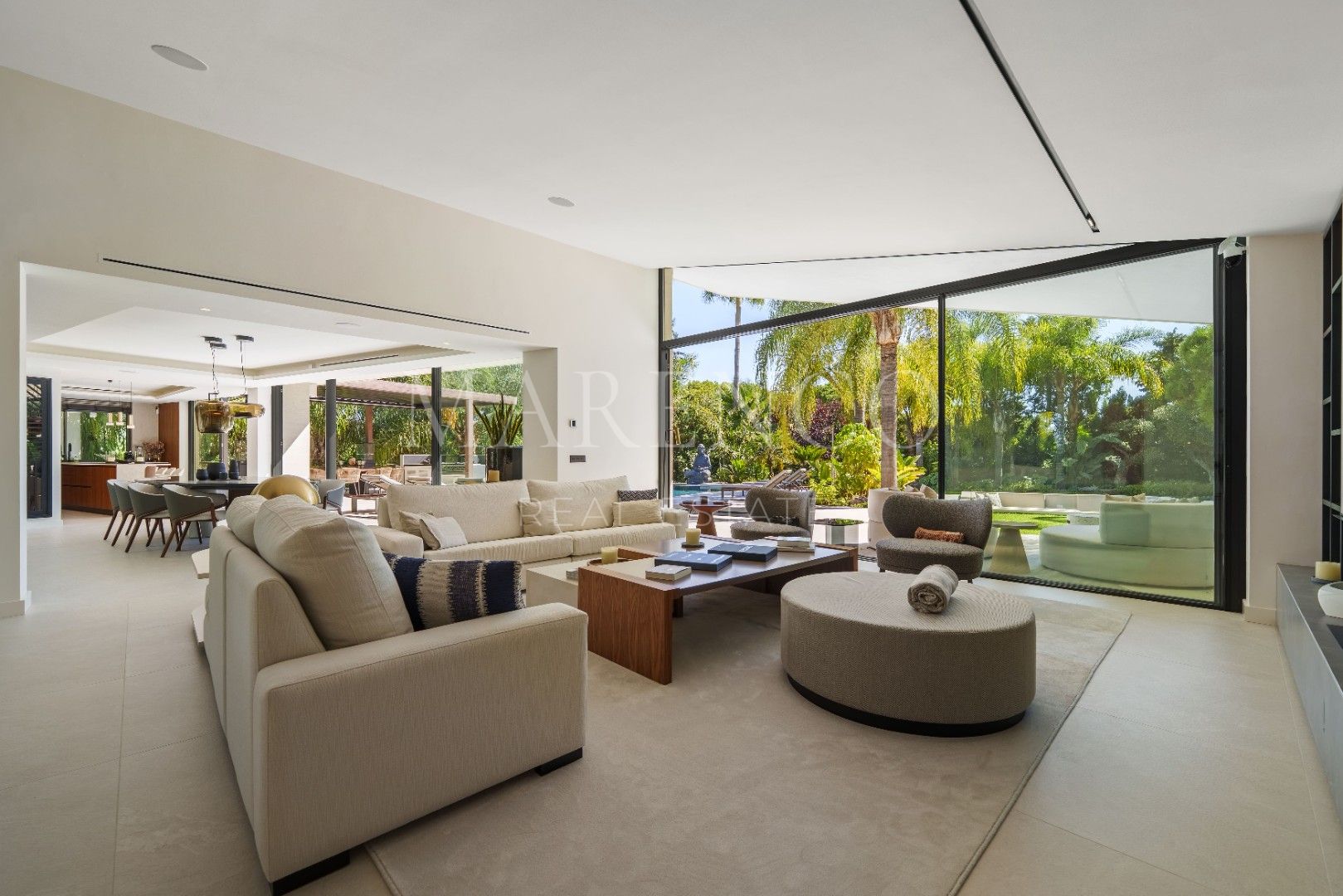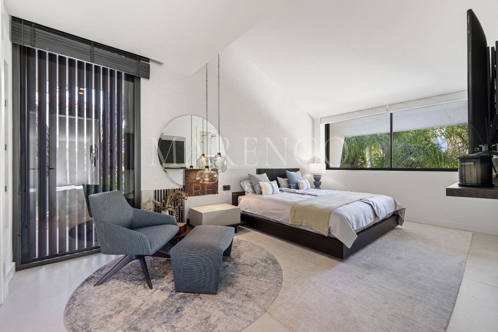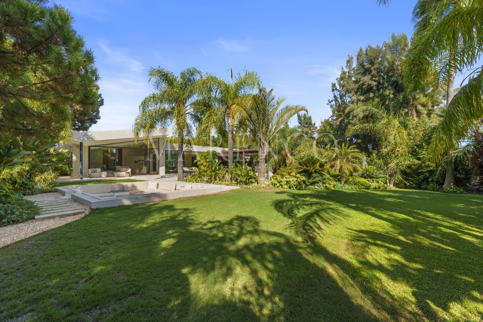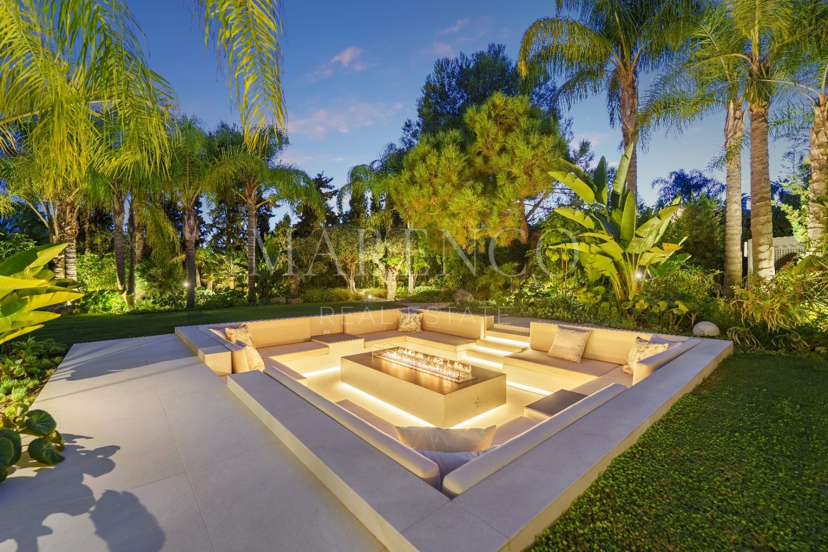 Het exterieur van Las Chapas 5 valt op door de volwassen palmbomen, die verschillende ontspanningsruimtes en een centraal zwembad omringen, dat wordt omgeven door stenen en ligstoelen. Daarnaast beschikt de villa over een overdekte eetterras en een buitenlounge met een verlaagde vuurplaats, die zowel overdag als ‘s avonds een uitnodigende sfeer creëren. Het ontwerp van de villa zorgt voor privacy en maximaliseert tegelijkertijd het genieten van het klimaat van Marbella.