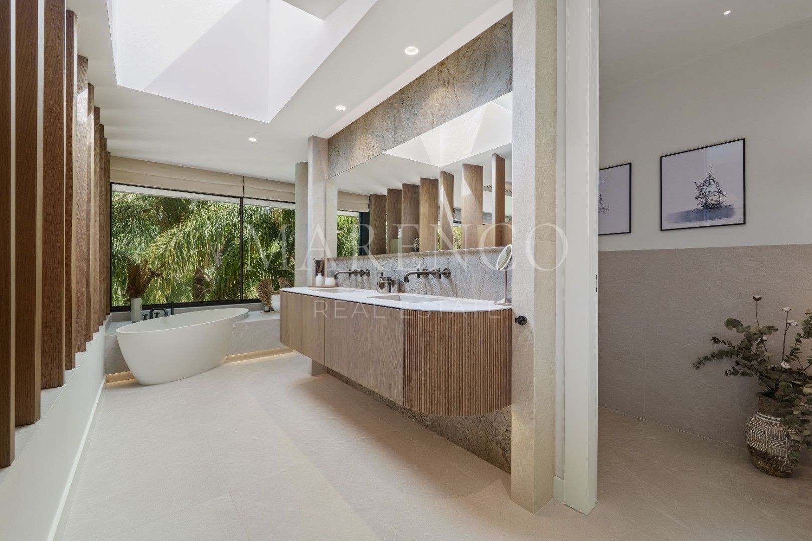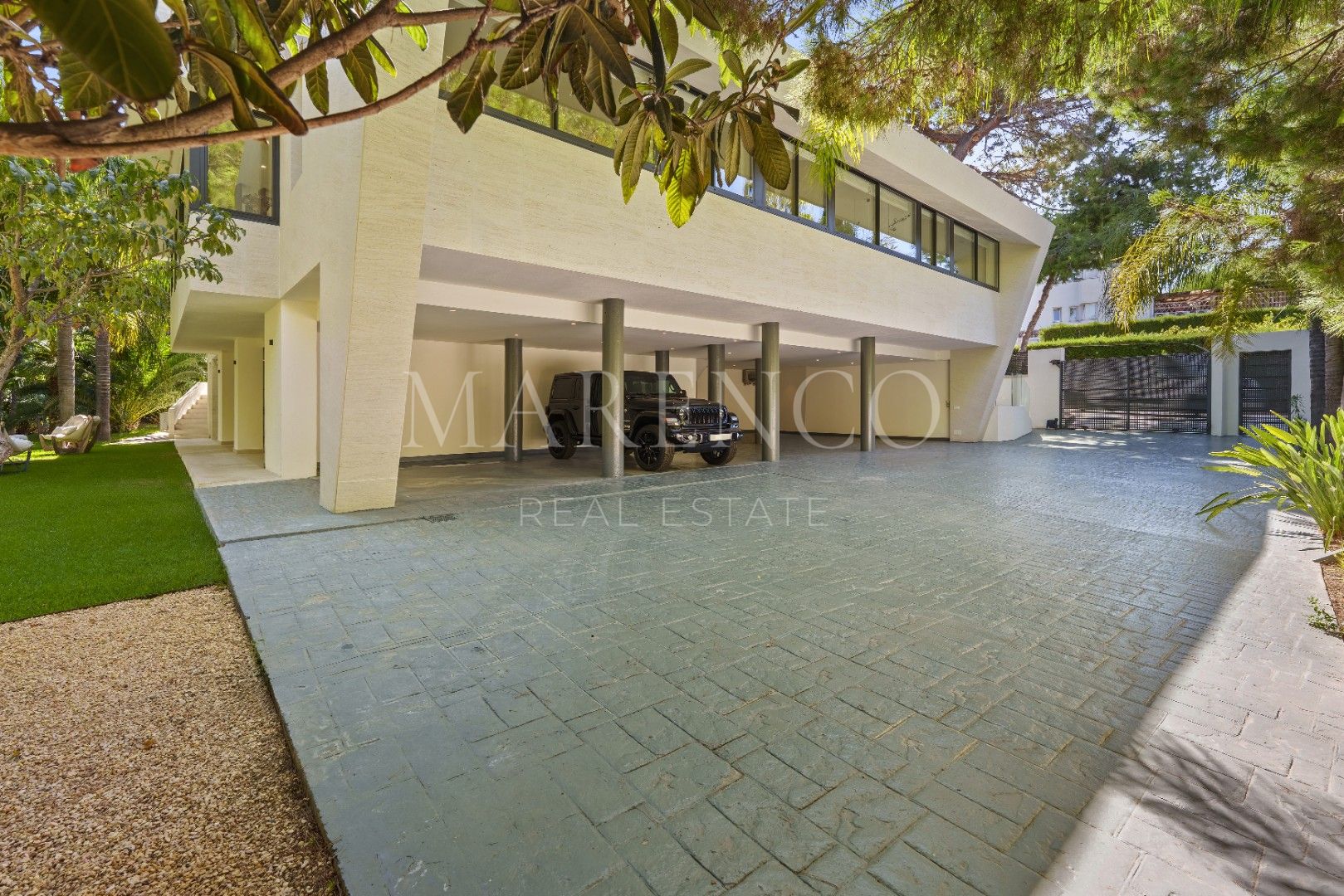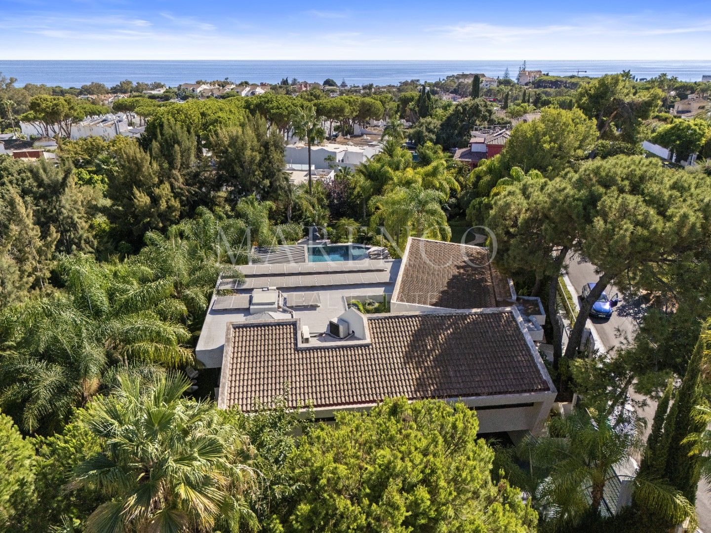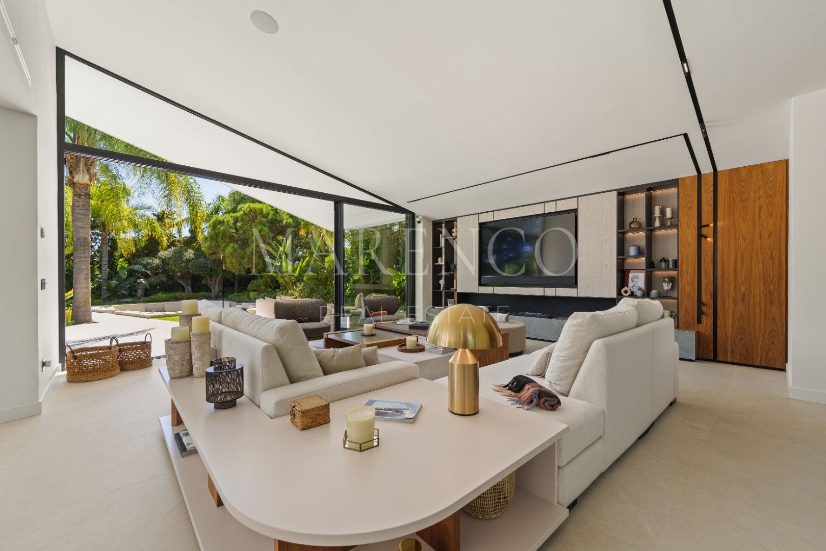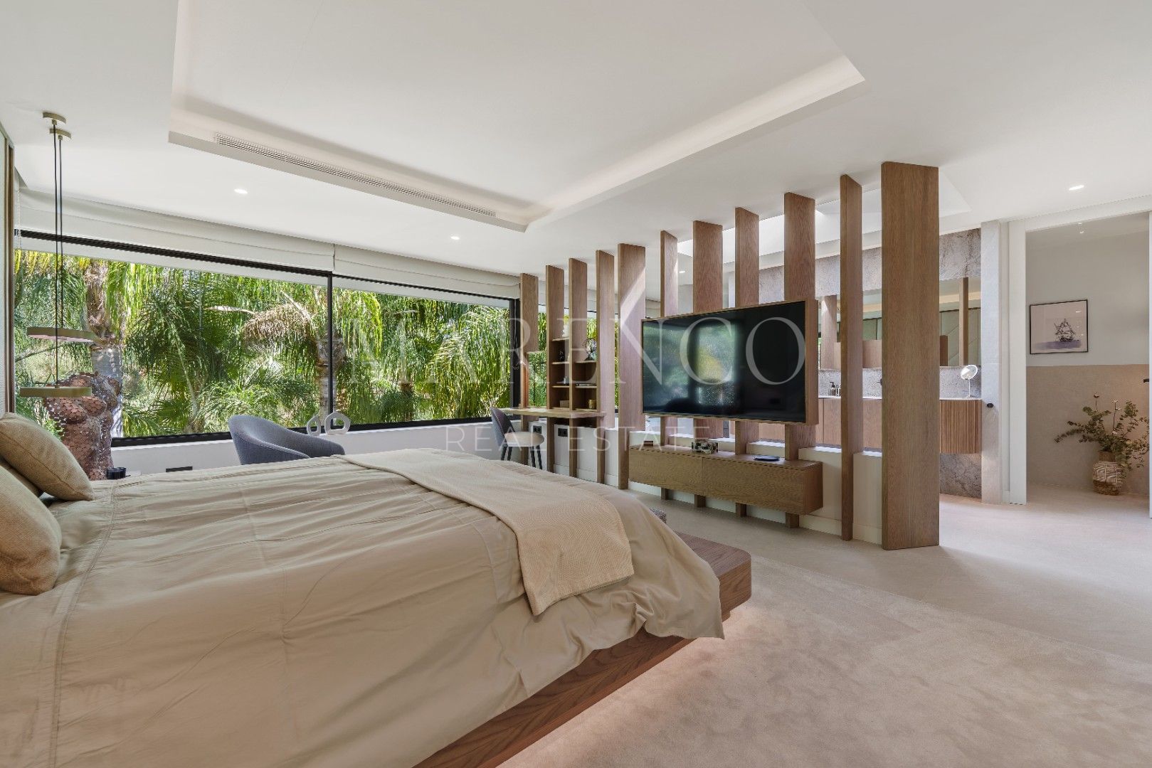 Het exterieur van Las Chapas 5 valt op door de volwassen palmbomen, die verschillende ontspanningsruimtes en een centraal zwembad omringen, dat wordt omgeven door stenen en ligstoelen. Daarnaast beschikt de villa over een overdekte eetterras en een buitenlounge met een verlaagde vuurplaats, die zowel overdag als ‘s avonds een uitnodigende sfeer creëren. Het ontwerp van de villa zorgt voor privacy en maximaliseert tegelijkertijd het genieten van het klimaat van Marbella.