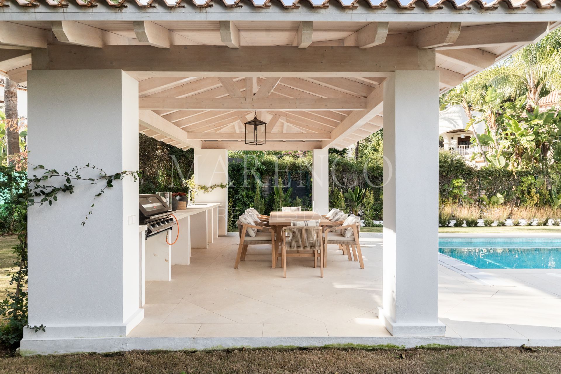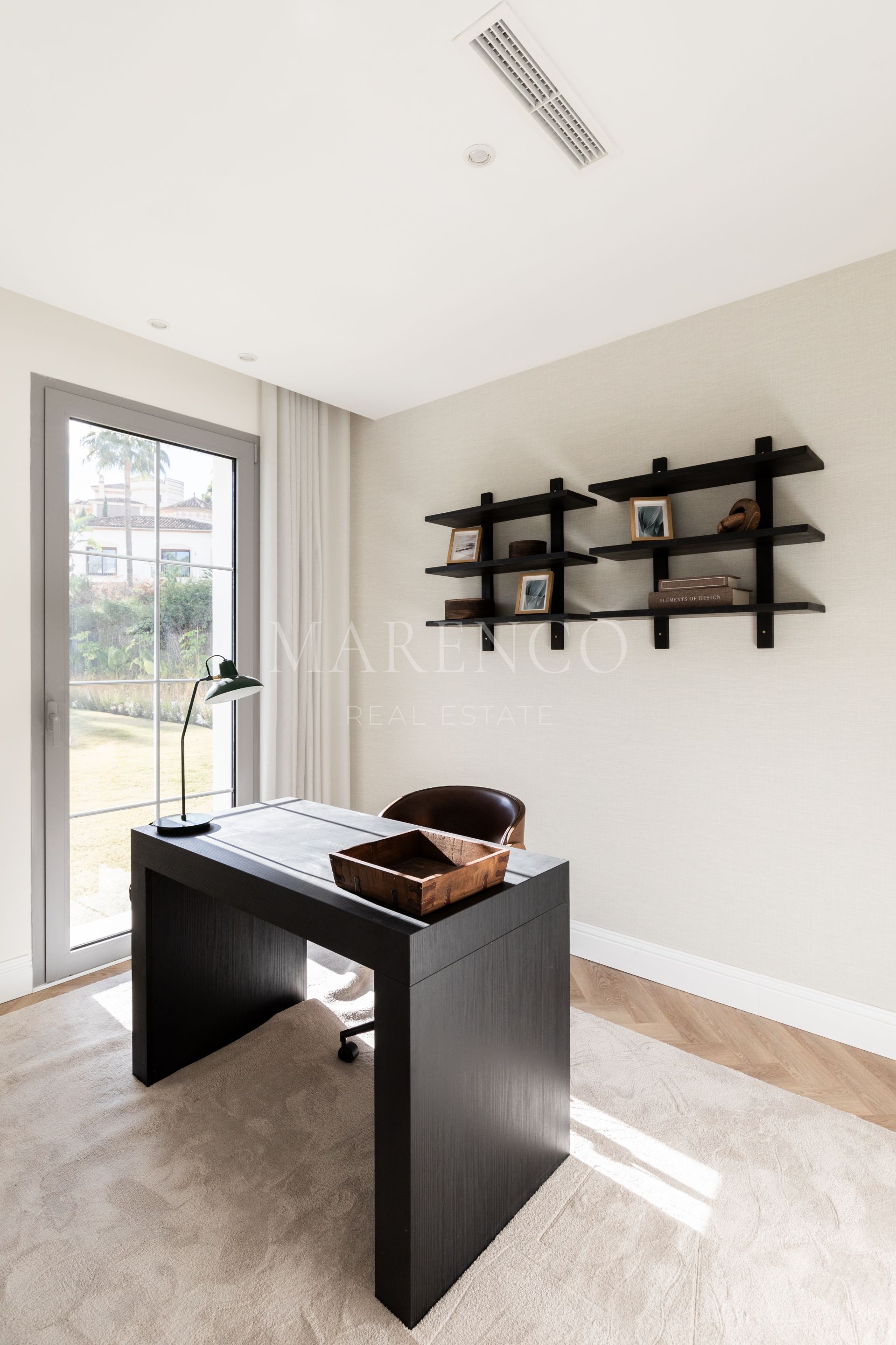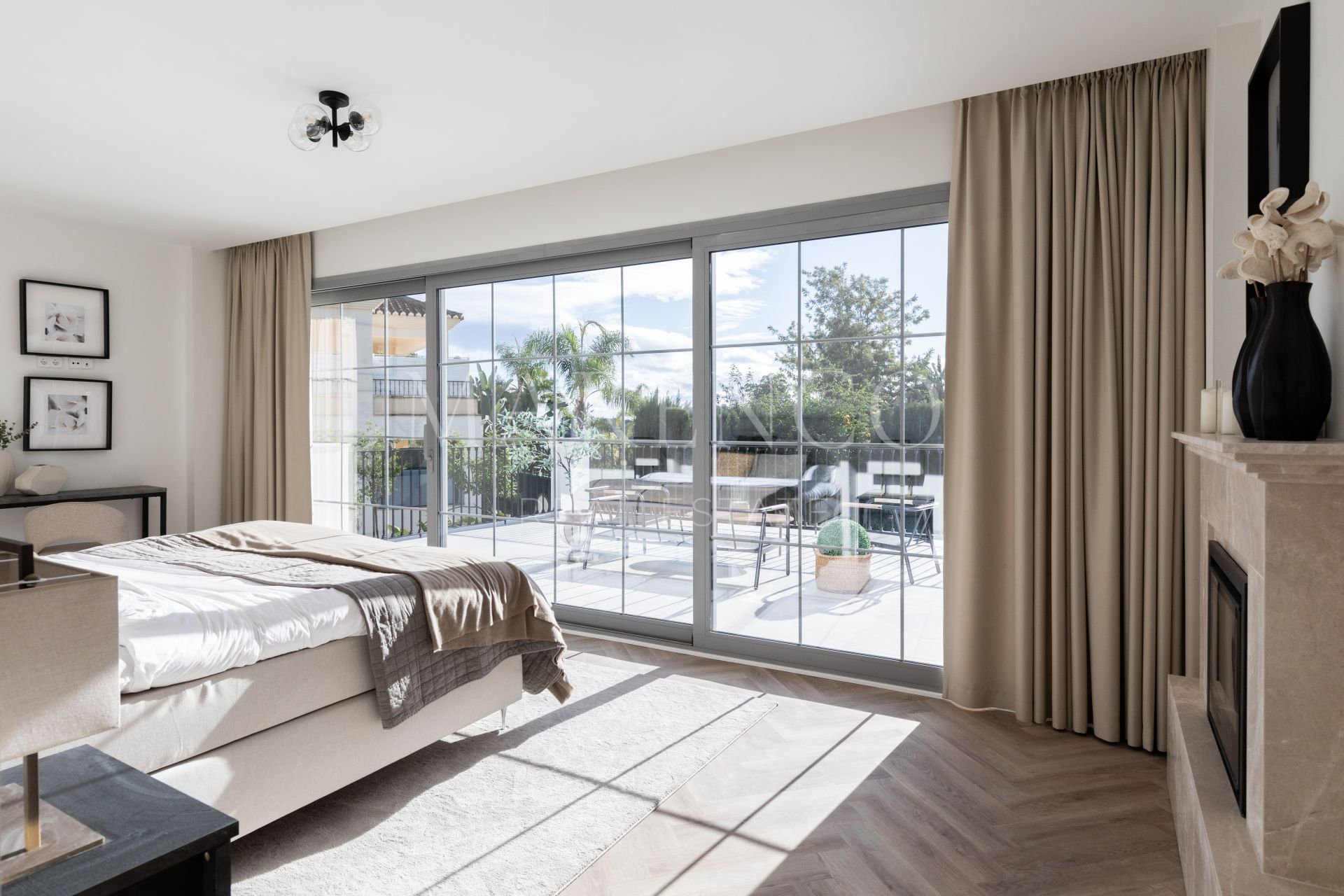 Buiten biedt de woning een prachtig onderhouden privétuin, zwembad en een overdekte buiten-eetruimte, perfect om het hele jaar door te genieten van het uitzonderlijke klimaat van de Costa del Sol. Grote ramen en ruime terrassen versterken de verbinding tussen binnen en buiten en zorgen voor veel natuurlijk licht. Daarnaast beschikt de villa over een privégarage voor twee voertuigen.
