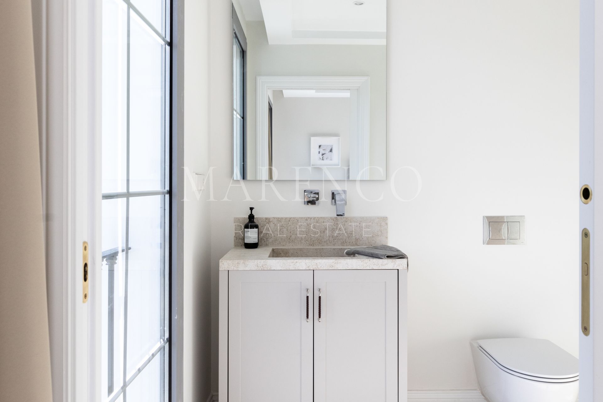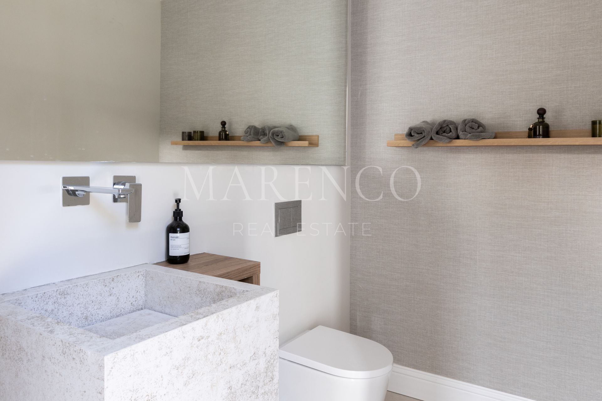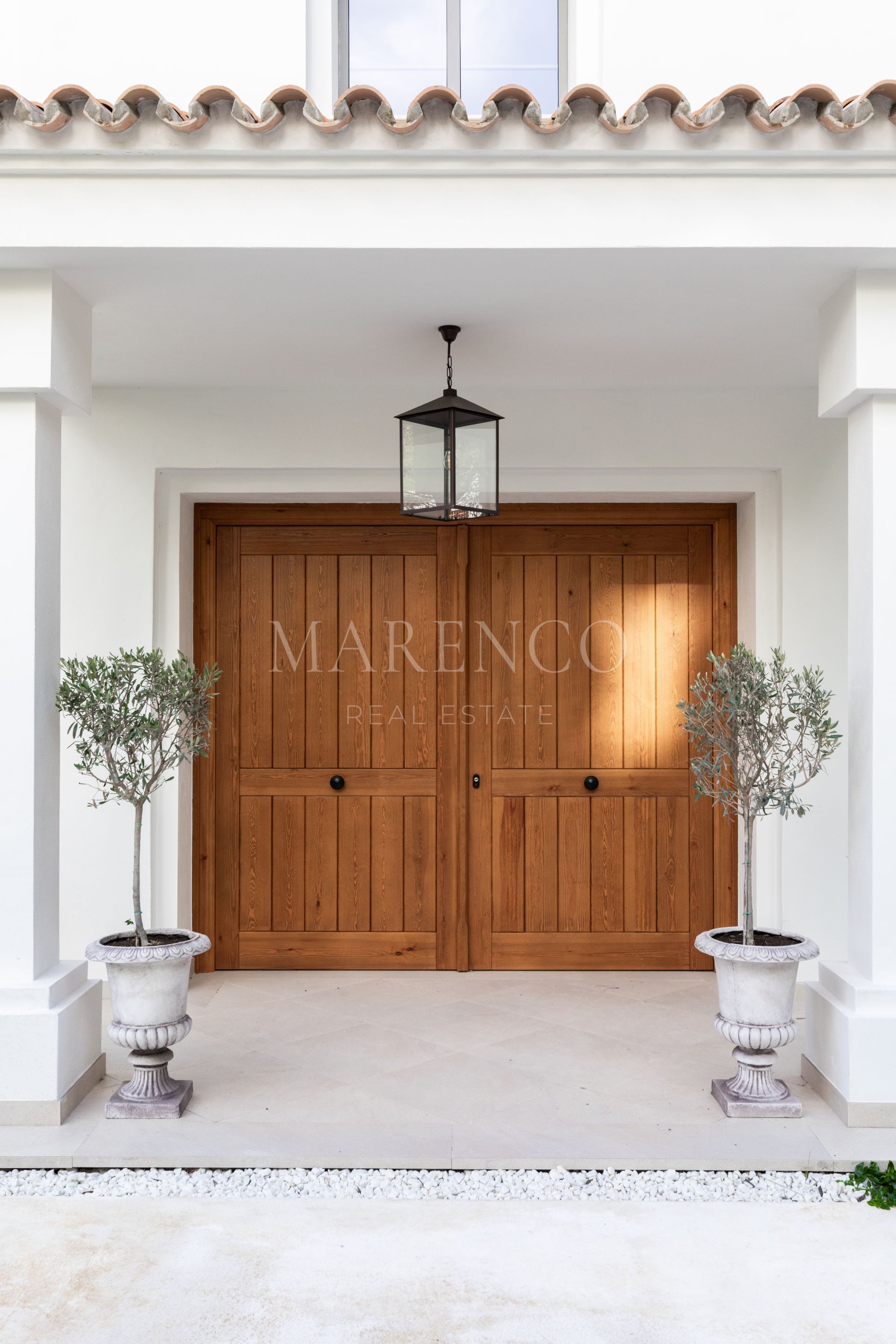 Buiten biedt de woning een prachtig onderhouden privétuin, zwembad en een overdekte buiten-eetruimte, perfect om het hele jaar door te genieten van het uitzonderlijke klimaat van de Costa del Sol. Grote ramen en ruime terrassen versterken de verbinding tussen binnen en buiten en zorgen voor veel natuurlijk licht. Daarnaast beschikt de villa over een privégarage voor twee voertuigen.