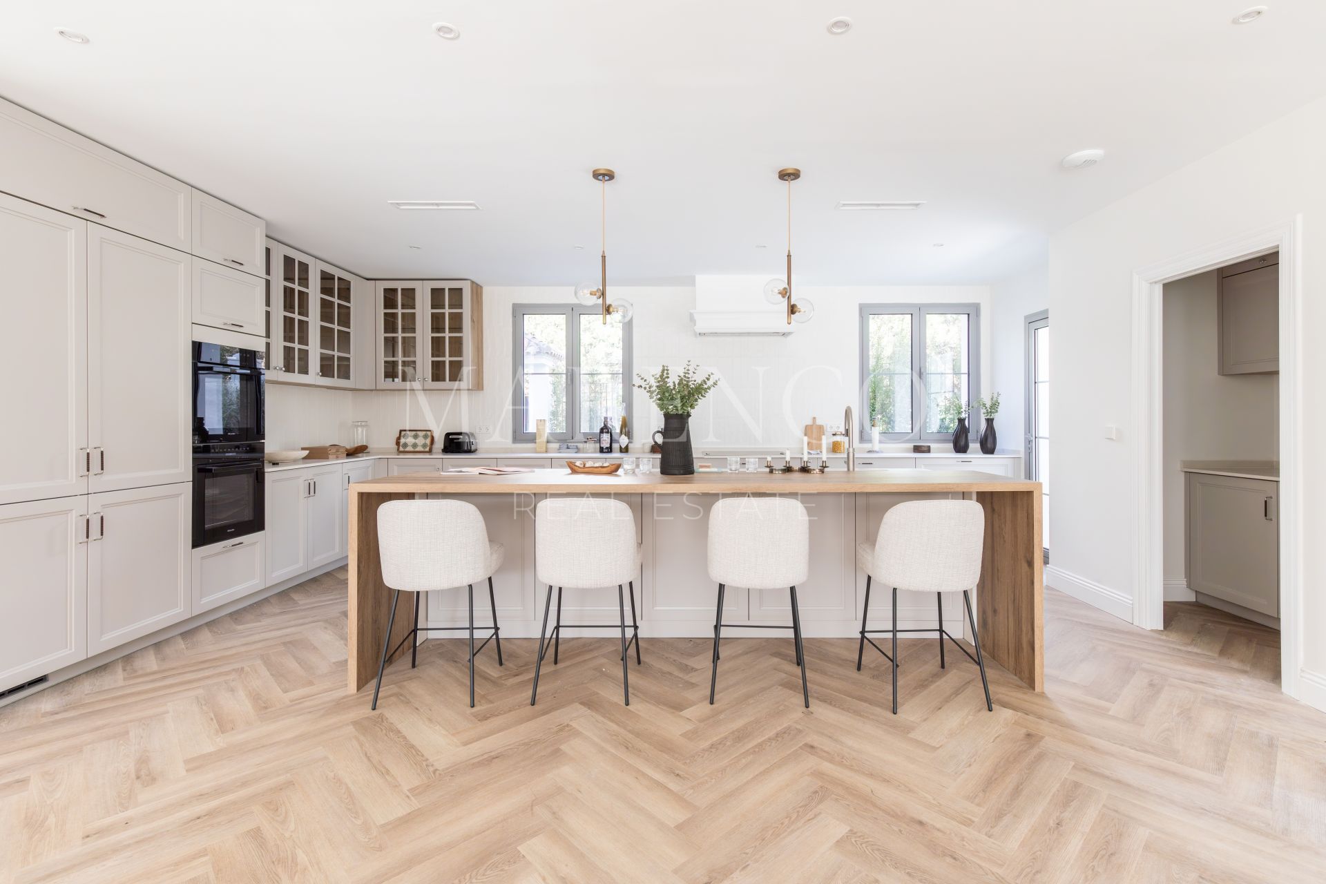 Met een bebouwde oppervlakte van 521 m² op een royaal perceel van 1.127 m² beschikt de villa over 4 ruime slaapkamers en 4 badkamers plus 2 gastentoiletten, verdeeld over een functionele en harmonieuze indeling. De hoofdwoonruimte bestaat uit een lichte open woon- en eetkamer die naadloos overgaat in een terras van 140 m², de aangelegde tuin en het privézwembad. De volledig uitgeruste keuken met hoogwaardige afwerking combineert stijl en functionaliteit, ideaal voor dagelijks gebruik en ontvangst van gasten.