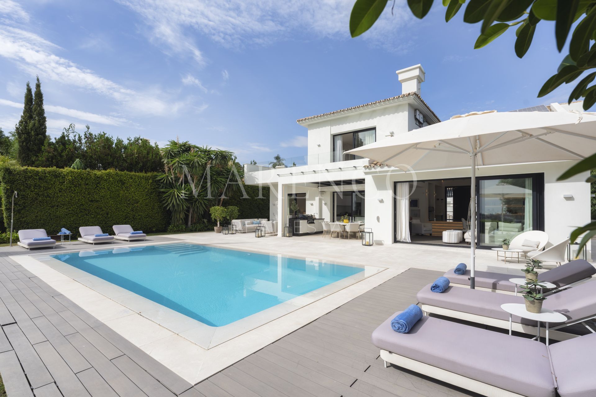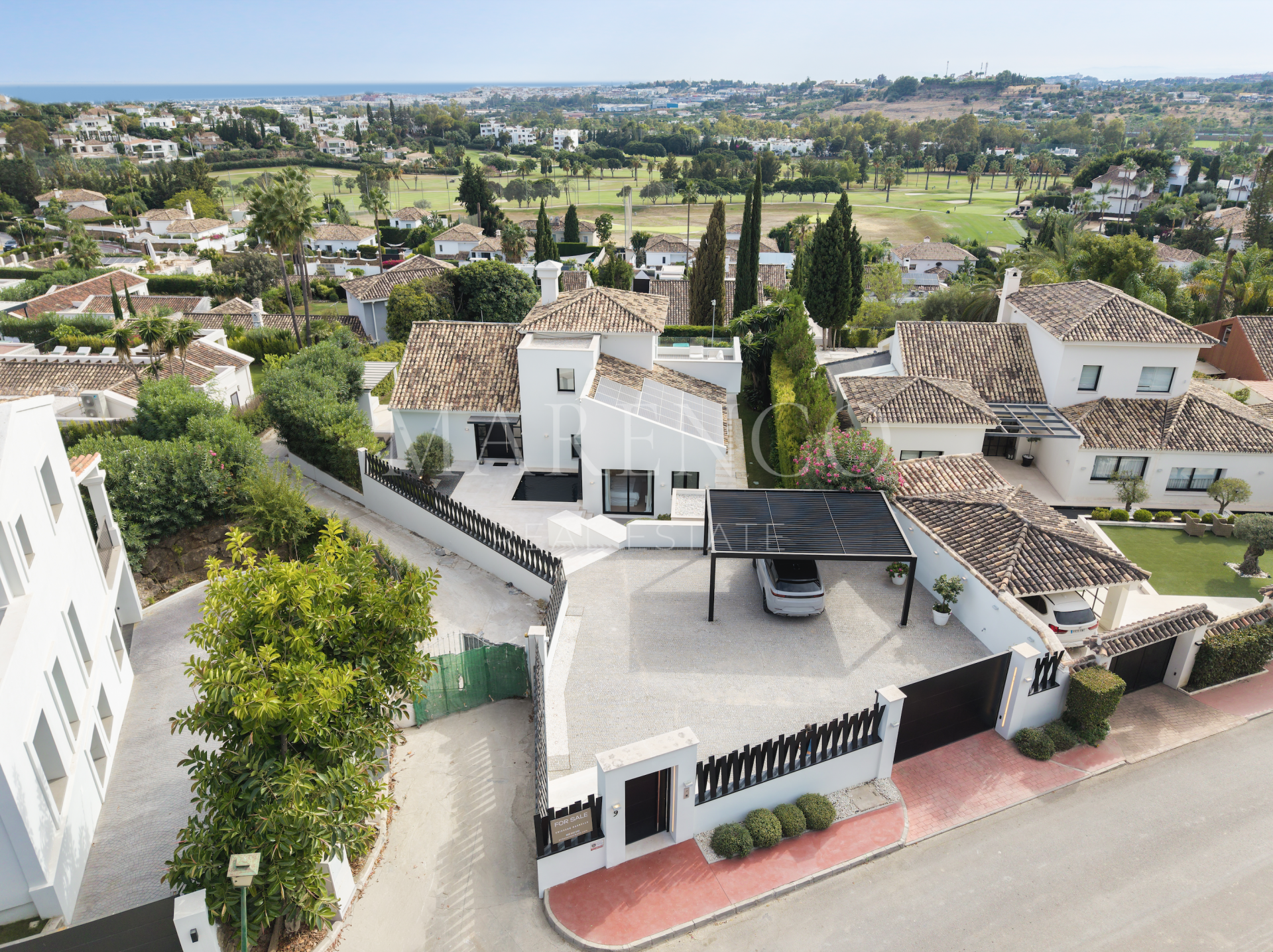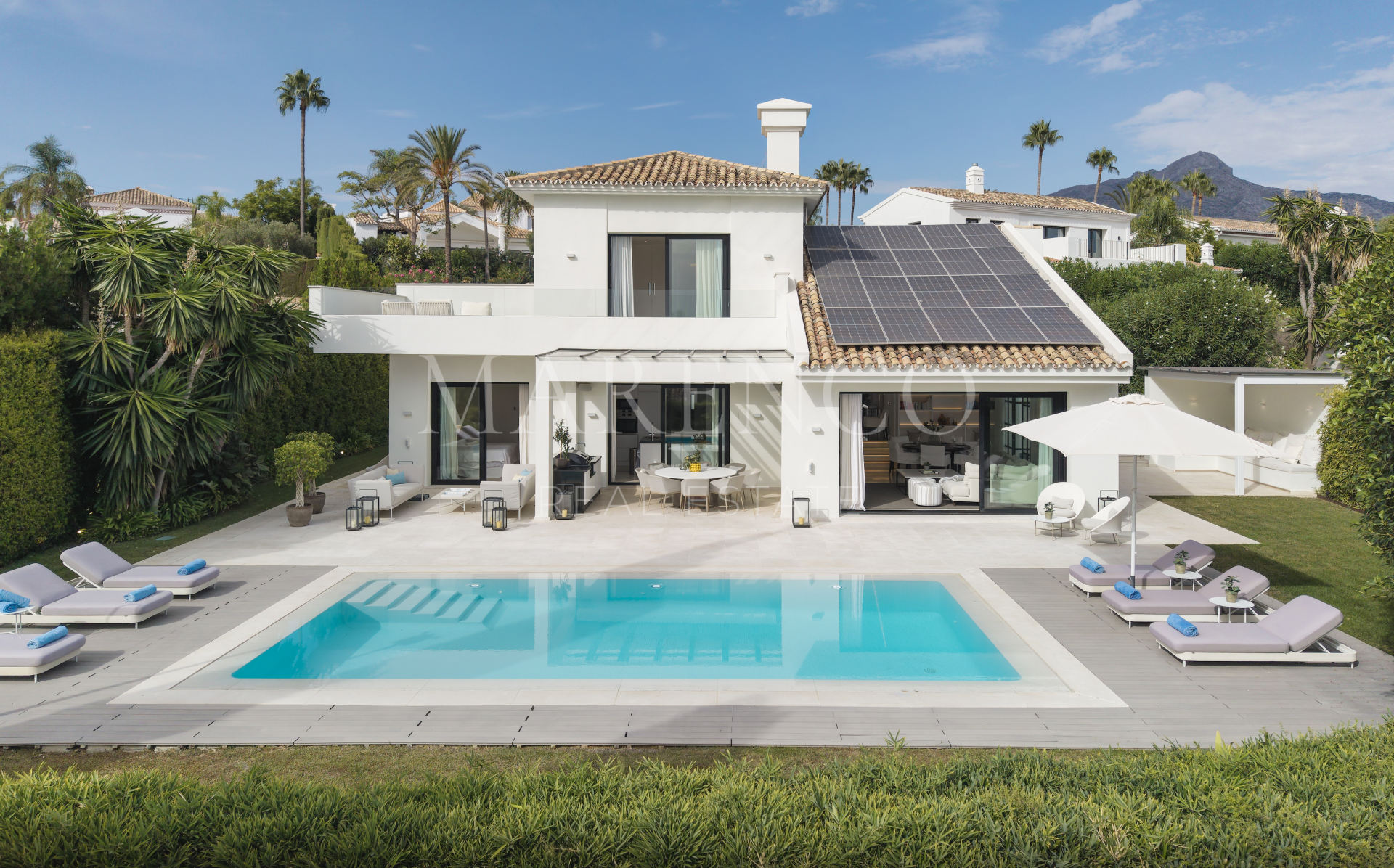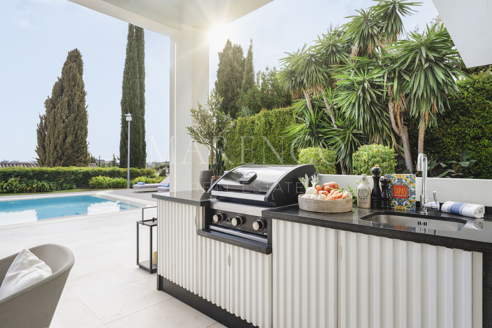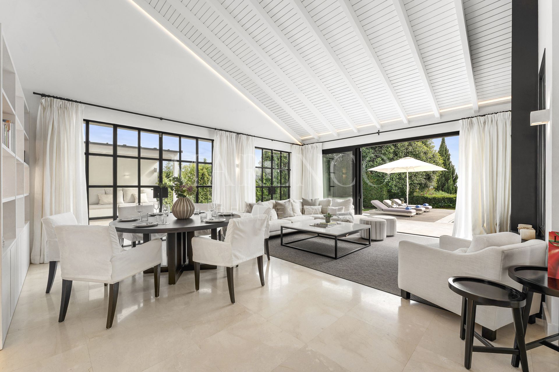 In het hart van de prestigieuze Golfvallei van Marbella combineert deze indrukwekkende villa in Los Naranjos Golf, Marbella op harmonieuze wijze Andalusische charme met modern design, licht en elegantie. Omgeven door rust en met panoramisch uitzicht op de bergen en de tuin, nodigt deze woning uit tot een ontspannen levensstijl waar elk detail is ontworpen voor comfort en schoonheid. Stel je voor dat je wakker wordt met het gezang van vogels, de deuren naar de woonkamer opent en de zachte mediterrane bries voelt terwijl de zon schittert boven je privézwembad – zo begint elke dag in Villa Begoña.