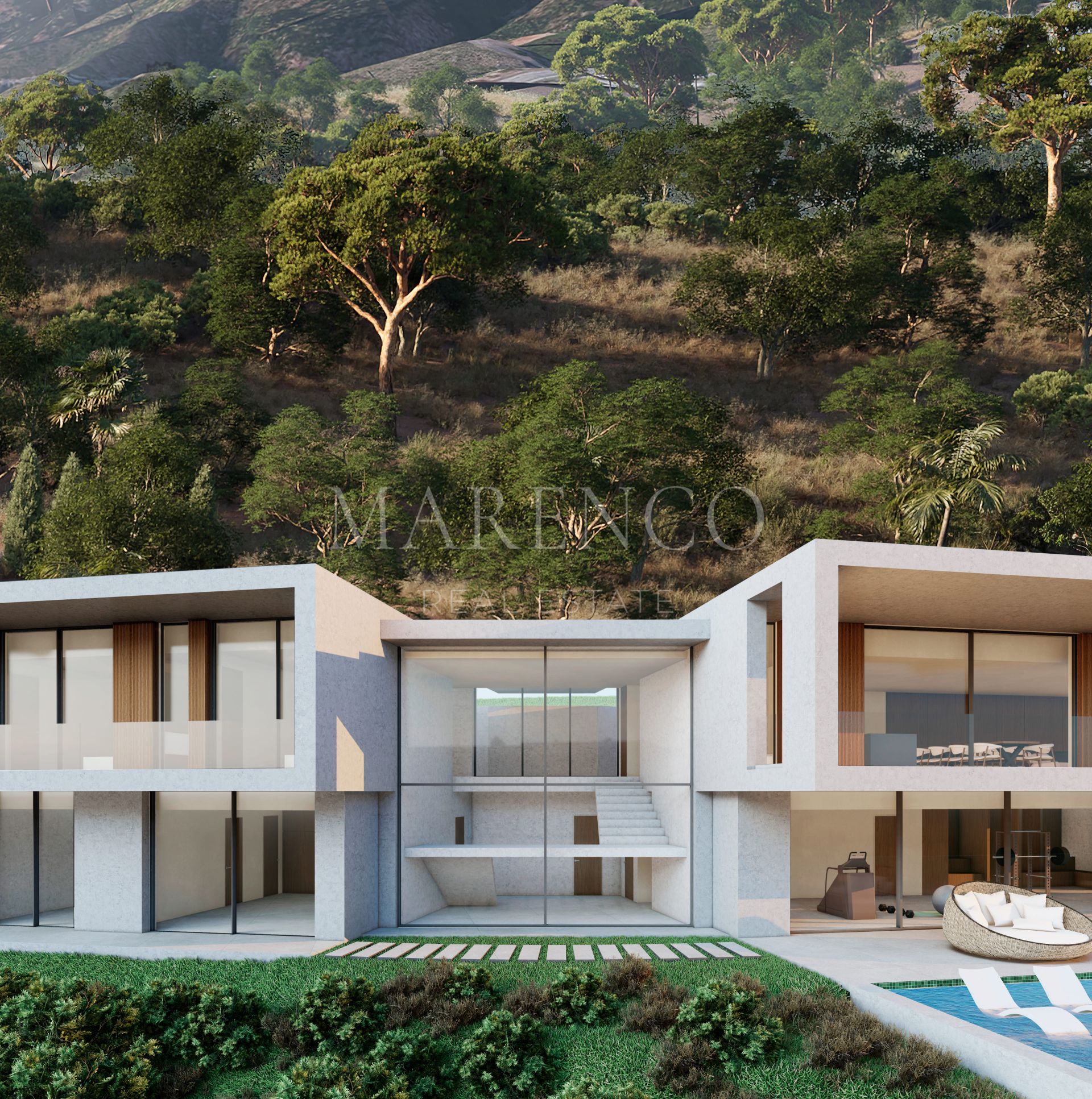 Op de benedenverdieping bevindt zich een privé fitness- en spa-ruimte voor optimaal welzijn en ontspanning. De villa is voorzien van vloerverwarming in de gehele woning en een verwarmd zwembad, ideaal om het hele jaar door van te genieten. De ruime overdekte en niet-overdekte terrassen — samen meer dan 600 m² — vormen een natuurlijke verlenging van het interieur. De garage biedt plaats aan vier auto’s en extra opslagruimte.