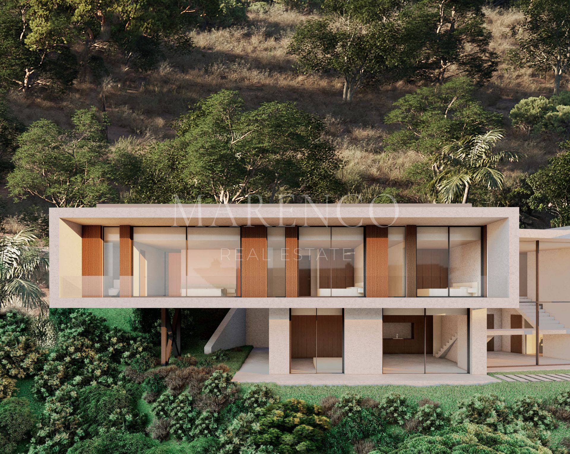 De villa is verdeeld over twee verdiepingen en biedt in totaal 707,96 m² bebouwd oppervlak op een perceel van 2.775 m². De woning beschikt over 4 slaapkamers met en-suite badkamers en een elegant gastentoilet op de hoofdverdieping. De hoge plafonds en kamerhoge ramen zorgen voor overvloedig natuurlijk licht en een permanent gevoel van ruimte en verbondenheid met het landschap. De volledig uitgeruste open keuken sluit naadloos aan op de woon- en eetruimte, ontworpen voor zowel dagelijks comfort als bijzondere momenten.