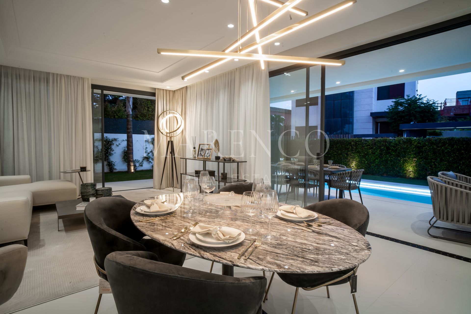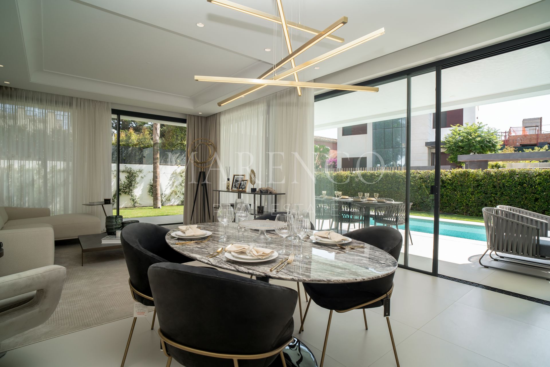 Vanuit deze ruimte hebben we directe toegang tot het terras met twee sferen: een overdekt gedeelte, perfect voor familiebbq’s, en een open gedeelte met ligbedden, waar je kunt genieten van een lang zwembad en de tuin.